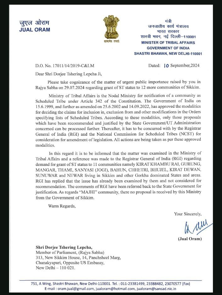 पत्रमा थप भनिएको छ, “सिक्किमका ११ समुदायहरूको लागि एसटी स्थितिको मागको सन्दर्भमा, जनजाति मामिला मन्त्रालयले यो मुद्दालाई भारतका रजिष्ट्रार जनरल (आरजीआई) लाई पठाएको थियो। जसको जवाफ अनुसार यो मुद्दा पहिले नै जाँच गरिएको थियो र आरजीआईबाट सिफारिस गरिएको थिएन। आरजीआईको टिप्पणी थप औचित्यको पूरा गर्नका लागि राज्य सरकारलाई फिर्ता पठाइएको छ।”
